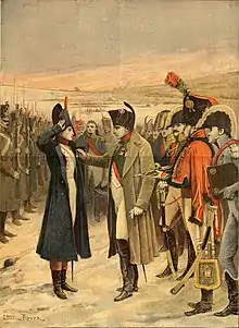 A Marie-Jeanne Schellinck is often reported to have been decorated with the Legion of Honor in June 1808 by Emperor Napoleon Bonaparte himself before he rode into Ghent and thus having been the first woman with that merit. This legend is embellished with an impressive list of battles where she was supposed to have fought (Jemappes, Arcole, Marengo, Austerlitz, Jena-Auerstedt and in the Poland campaign 1807), as well as a rousing speech Napoleon gave the assembled soldiers.[3] In 1890, the first image was fabricated that was supposed to show the ceremony. Many repetitions of the legend also allege that Schellinck's service record and testimony from military comrades and commanders resulted in her being granted a pension of 667 livres per year for her service to France.[1]