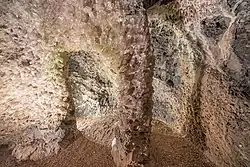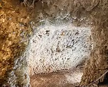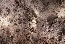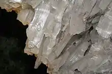 Only the crystal grotto is of natural origin. This grotto, measuring seven by ten meters and reaching up to ten meters in height, was created through a process of leaching.[4] Over millions of years, it was shaped by the dissolution of minerals in the rock. The cavity is lined with large, colorless, translucent white crystals of gypsum spar, which formed as a result of seepage and groundwater infiltrating an aqueous solution of calcium sulfate. This crystal grotto is unique because, unlike most other cavities in gypsum rock, the gypsum within this cavity crystallized. These crystals, known as Marienglas, are composed of calcium sulfate and belong to the mineralogical category of gypsum, specifically in the selenite crystal form.[5] On display in the crystal grotto are gypsum crystals two to eight centimeters thick and up to 90 centimeters long.[6][7] This crystal grotto is regarded as one of Europe's largest and most stunning. Natural gypsum caves can also be found in the karst region at the southern edge of the Harz Mountains, such as the Heimkehle cave.[2]