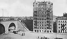 The historical neighbourhood was officially established in 1762,[1] when local nobleman Eustachy Potocki married Maria Kątska and received the parcel of land as part of Kątska's dowry. He established a jurydyka (an administrative self-governing exclave of the city) and named the settlement Maryenstadt after his wife, adding the German suffix stadt to please the Saxon king of Poland.[2] After World War II, the spelling "Mariensztat" was adopted, though with a different pronunciation ([ˈmarjɛnʂtat]) than Marienstadt [maˈʁiːənʃtat] has in German. The town was mostly a place for trade, particularly for fresh produce that arrived by the river. The majority of the area's dwellings were wooden manors; several brick or stone tenement houses with red-terracotta roof tiles were owned by wealthier merchants.[1] In 1784, it was incorporated into Warsaw and lost its independent town status.