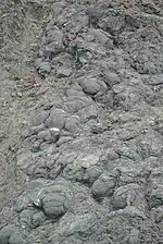 The Marin Headlands are underlain by geological formations created by the accretion of oceanic sediments from the Pacific Plate onto the North American Plate. The process of subduction of ocean floor, followed by tectonic underplating to the underside of the over-riding plate, was first described here by Clyde Wahrhaftig in 1984.[4] The primary rock types of the Marin Headlands include graywacke sandstone, radiolarian chert, serpentinite, pillow basalts, and shale. These rocks began their migration over one hundred million years ago from as far south as present-day Los Angeles.[5] The erosion of the hillsides and construction activities during the military era have exposed some dramatic examples of these rock types for easy viewing, and the folding caused by tectonic action is visually evident in many places throughout the Headlands.[6]