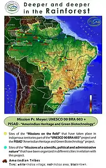 His missions in the Amazonian rain-forest (see map at right) in close contact with the "People of Nature", the Índios[8] gave him a new conception of Man-Nature interaction.[9] They lead him to combine his expertise in neuro-psychology in the field of linguistic and cultural diversity with his experience in biological diversity and its preservation by bio-technologies.