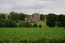 In 1543, David Beaton bought Melgund Castle from his widowed sister-in-law. The castle became Marion's home. A chamber in the new tower has their heraldry displayed over the windows, just as any landed married couple.[7] The Cardinal was killed at St Andrews Castle in 1546. According to John Knox, Marion had just left the castle by the privy postern before it was overwhelmed by Beaton's enemies.[8] In 1547, Marion married a William Douglas, but was a widow by 18 September 1547.