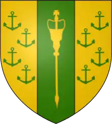 Or on a pale between eight anchors Vert each side two and two dexter in bend and sinister in bend sinister a representation of the mace of the Legislative Assembly of the Province of Prince Edward Island Or.