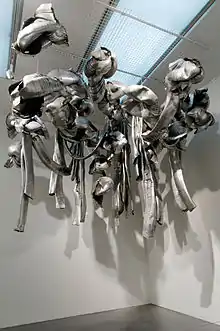 In June 1967, Merz had her first solo exhibition at the Gian Enzo Sperone Gallery in Turin, for which she made a folded aluminum foil installation.[7] In December 1967, she had another show at the Piper Pluri Cub, a Turin disco that had opened the year before to host radical artistic events.[6] In October 1968, she participated in the three day Arte Povera + Azione Povera event, curated by Germano Celant, in Amalfi.[8] This Arte povera event, which also included the artists Michelangelo Pistoletto, Alighiero Boetti, Giovanni Anselmo, and Mario Merz, was radical for its avant-garde display of every day "poor" materials as art.[8] Her work continued to reflect many of the fundamental issues with which Arte Povera artists are preoccupied, such as organic forms, subjectivity, the use of lower forms of art, including crafts, and the relationship between art and life. In 1969 she had a solo exhibition at the Attico Gallery in Rome.[7] Her works took on an openly environmental character in a series of "rooms."[9] Her husband Mario was supportive of her art and her career and would help her with her installations.[10] In 1975 she also had a solo exhibition in Rome. This exhibition featured installations made by using knitted copper, under the title of Ad occhi chiusi gli occhi sono straordinariamente aperti ('To closed eyes, the eyes are extraordinarily open').[11]