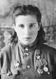Mariya Savelyevna Shkarletova (Russian: Мария Савельевна Шкарлетова, Ukrainian: Марія Савеліївна Шкарлетова; 3 February 1925 – 2 November 2003) was a field medic in the 170th Guards Rifle Regiment during World War II. During the war she participated in offensive operations in Ukraine, Moldova, and Poland for which she was awarded the title Hero of the Soviet Union on 24 March 1945.