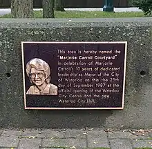 A courtyard outside of Waterloo City Centre was dedicated in her honour on September 25, 1987.[2] In 2004, the birthing centre at the Grand River Hospital was renamed the Marjorie Carroll Childbirth Centre. A nursing lecture hall at Conestoga College was also named in her honour.[1] She was awarded the Queen Elizabeth II Diamond Jubilee Medal in 2013.[2][4]