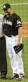 On December 7, 2011, Buehrle agreed to a four-year, $58 million contract with the Miami Marlins.[41] In his debut with the Marlins, Buehrle recorded a loss, giving up two earned runs, in six innings pitched against the Cincinnati Reds.[42] On May 5, Buehrle threw a complete game against the San Diego Padres. The Marlins won that game 4–1.[43] Buehrle won his fourth straight Fielding Bible Award in 2012.[44]