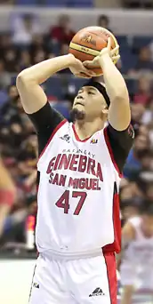 In a 2014–15 Philippine Cup win over the Blackwater Elite, Caguioa scored 10 of his 18 points in the fourth quarter.[143] He then had 15 points and seven assists in a win over Barako.[144] On November 21, 2014, against Meralco, he became only the 20th player to reach the 9,000 point milestone, but Ginebra lost that game.[145] In a Commissioner's Cup win over SMB, he scored nine of his 17 points in the fourth quarter.[146] He earned his eighth All-Star appearance that season, finishing in the top 10 in votes to become a starter for the North All-Stars team.[147] However, a back injury forced him to back out of playing in the All-Star Game.[148] During a Governors' Cup win over Rain or Shine, he and Tenorio combined for 38 points.[149] He then hit the go-ahead jumper that gave Ginebra the lead in overtime and eventually the win against GlobalPort.[150] A broken finger on his left finger however, ended his season early.[151]