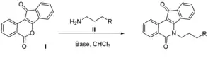 Dr. Cushman is the world leader in the design and synthesis of the indenoisoquinolines.[16] These drugs, which were discovered serendipitously during a synthesis of the antileukemic agent nitidine chloride, can eradicate cancer cells. The seminal paper describing the synthesis of the molecules, using the Castagnoli-Cushman Reaction, was published in The Journal of Organic Chemistry.[17] Alternatively, the indenoisoquinolines can be prepared by reacting a benz[d]indeno[1,2-b]pyran-5,11-dione (I) with an amine (II).