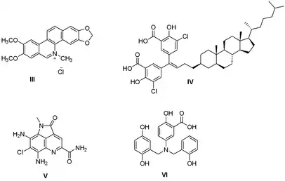 Another main contribution of Mark Cushman and his group deals with the synthesis of various natural products and pharmacologically active synthetic substances. Some of the compounds his group prepared include: the antileukemic agent nitidine chloride (III);[25] corydaline,[26] which possesses antinociceptive and antiallergic activities among others; thalictricavine,[27] an inhibitor of human acetylcholinesterase and butyrylcholinesteras;[28] berlambine;[27] (±)-canadine; (+)-thalictrifoline;[29] cosalane (IV),[30] a molecule that inhibits HIV by acting on various targets;[31] (±) chelidonine,[32] a non-specific cholinesterase inhibitor; ammosamide B (V),[33] a cytotoxic natural product that targets myosin;[34] lavendustin A (VI),[35] a tyrosine kinase inhibitor;[36] and (+)- and (–)-corynoline.[37][38]