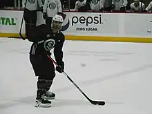 Despite having the option to become an unrestricted free agent following the 2010–11 season, Giordano opted to remain in Calgary and signed a five-year, $20 million contract extension with the Flames on October 29, 2010.[22] He led the team's defencemen in scoring and set another career high with 43 points in 82 games.[23] Giordano missed several weeks of the 2011–12 season after suffering a torn hamstring.[24] The injury caused Giordano, who was named an alternate captain prior to the season's start, to miss 21 games.[23] He finished with 27 points in 61 games, then scored 15 points in 47 games in the lockout-shortened 2012–13 season.[9]