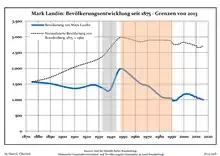 Development of Population since 1875 within the Current Boundaries (Blue Line: Population; Dotted Line: Comparison to Population Development of Brandenburg state; Grey Background: Time of Nazi rule; Red Background: Time of Communist rule)