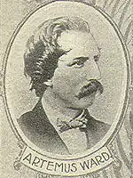 Twain attended many of the plays and entertainments that came to Virginia City and was invited to meet the famous actress Adah Isaacs Menken after a good review he wrote for her, but as the Routledge Encyclopedia of Mark Twain states: "Most importantly, he met Artemus Ward on his week-long visit to Virginia City in December 1863."[4] This visit had a lasting impact on Twain. Ward had come to deliver a lecture but stayed for three weeks into January 1864, drinking, eating oysters, and engaging in roof walking on the buildings of hilly Virginia City with Twain, and his friends Joe Goodman, and Dan De Quille ("jumping from one roof down to another"[2]).[15]