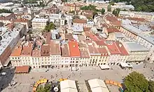 Rynok Square (Ukrainian: Площа Ринок, romanized: Ploshcha Rynok, Polish: Rynek we Lwowie, German: Ring) is a central square of the city of Lviv, Ukraine. According to archaeological data, the square was planned in the second half of the 13th century, during the reign of Prince Leo I of Galicia.[1][2] However, there is a long tradition of later dating the emergence of the square, associated with the activities of the Polish king Casimir III the Great.[3]