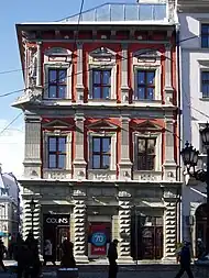 - Number 23. Scholz-Wolf House. Renaissance style, built in 1570 for the Scholz-Wolf family, which came to Lviv from Silesia. It is richly decorated; on the second floor there is a sculpture Baptism of Christ, probably by Herman von Hutte or Sebastian Czeszko.[4] In this house, among others, lived a renowned 17th century Polish poet, Szymon Szymonowic.