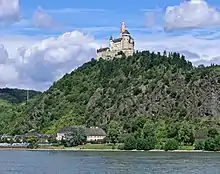 The Marksburg is a castle above the town of Braubach in Rhineland-Palatinate, Germany. It is one of the principal sites of the Rhine Gorge UNESCO World Heritage Site. The fortress was used for protection rather than as a residence for royal families. It has a striking example of a bergfried designed as a butter-churn tower. Of the 40 hill castles between Bingen am Rhein and Koblenz the Marksburg was one of only two which had never been destroyed (the other being Maus Castle) and at least the only one that had never fallen into disrepair.[1]