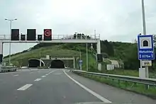 The Markusbierg tunnels are a pair of parallel tunnels, which form the most easterly section of the A13 motorway through Luxembourg, near the town of Schengen. The tunnels are 1575 metres in length, and descend easterly, towards the German border at a 5% gradient. The eastern end of the tunnel runs directly to a viaduct crossing the river Moselle, which forms the border with Germany.