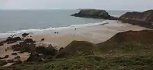 Marloes Sands (Welsh: Traeth Marloes)[1] is an approx. 1.5 kilometres (0.93 mi) long remote sandy beach in Pembrokeshire, Wales, near the village of Marloes. It's broadly curved and surrounded by cliffs. Walking on the beach gives great views of Skokholm Island and Gateholm Island.