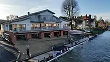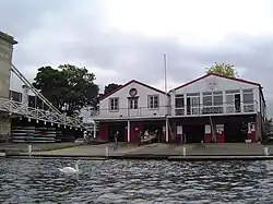 The local football club Marlow F.C. was founded at a dinner at Compleat Angler Hotel in 1870. At a football club dinner at the Angler, members decided that what the town needed next was a rowing club, and further meetings were held to found one, which happened on 16 May 1871.[1] Rowing was already established in the town, and the Marlow Regatta, a separate organisation to the rowing club, had been running since around 1855. Initially the club had no home and rowers sheltered under Marlow Bridge on the Buckinghamshire side, but when the freeholder died in 1888 they had to move to Meakes and Redknap boathouse on the other side of the river. In 1892 Edward Riley offered to allow the use of his land just above the Meakes boathouse, by 1896 Mr Wethered, the club captain (from the local brewery family) obtained a lease from Mr Ward, a life tenant of the site that the club now occupies. The clubhouse was complete in 1896 and formally opened in 1897. Ward died 10 years later, but the new owner, Mr Borgnis, granted a new lease[1] the club remained a tenant of sympathetic landlords until it acquired the freehold following the 2011 fire. The neighbouring land was acquired from Sir James Boyton (who still has a boat named after him).