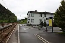 Most trains serve track 1, a side platform situation at grade with the station building, access roads and parking. Track 2 is served with an island platform, albeit which only has access to trains on the one track. Track 2 is only used when two passenger trains pass at the station. Both platforms are 220 meters (720 ft) long and 76 centimeters (30 in) tall.[3] The station building is open around the clock except from 21:00 on Saturday to 07:00 on Sunday. It has universal accessibility, including to its washroom. There is parking for 15 cars and a roofed bicycle stand. There is no ticket machine.[9]