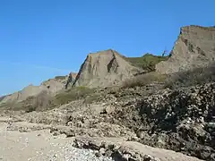 The Marnes de Dives is a geological formation in Normandy, France. It dates back to the upper part of the Callovian stage of the Middle Jurassic.[1] And is partially equivalent to the Oxford Clay in England. It predominantly consists of ooidal marl, rich in pyrite and lignite, interbedded with thin limestone horizons.[2] It is best exposed at the base of the Falaises des Vaches Noires (Cliffs of Black Cows) as well as the foreshore at low tide. It is known for its fossils, notably those of ammonites, marine crocodiles and fragmentary remains of dinosaurs, mostly theropods.