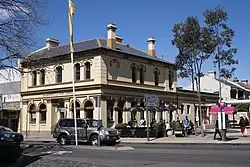 The building frontage to Marrickville Road is two-storied with loosely Renaissance articulation: pilasters on each side of a central doorway on the ground floor, two arched windows either side, and a reproduction of this pattern in the five first floor windows. The first floor was treated as an astylar piano nobile/attic. The pattern was inverted on the Silver Street side, facing northwest, where two entrances were placed at either end of the double-storeyed section's street front, with two bays containing a pair of arched windows placed between each entrance. A pilaster separates the two bays of windows.[1]