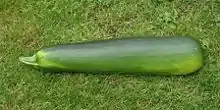 A marrow is the mature fruit of certain Cucurbita pepo cultivars used as a vegetable. The immature fruit of the same or similar cultivars is called courgette (in Britain, Iran, Ireland, France, the Netherlands, Singapore, Malaysia and New Zealand) or zucchini (in North America, Japan, Australia, the Czech Republic, Italy, Germany and Austria).[1] Like courgettes, marrows are oblong, green squash, but marrows have a firm rind and a neutral flavour, making them useful as edible casings for mincemeat and other stuffings.[2] They can be stored for several weeks after harvest (like pumpkins and other winter squash), to be processed for food when required.[3] They are a vegetable used in Great Britain and areas with significant British influence, though their popularity is waning in favor of immature summer squash like courgette.[1]
