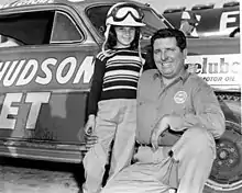 ![]() Teague beside the Fabulous Hudson Hornet with his daughter at the Daytona Beach Road Course in 1952 | |||||||