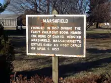 The town of Marshfield was platted on May 22, 1857, and named for Marshfield, Massachusetts, the home of statesman Daniel Webster.[3] A post office was established on April 6, 1857, which operated until 1989. In 1870, the population was 150 and, by 1900, it had grown to 250. In the late 1800s, the town had a dry goods store, a hotel, three churches, three saloons, two blacksmith shops, a grain warehouse, a wagon and carriage manufactory, a grocery store, a drug store and three physicians.[4]