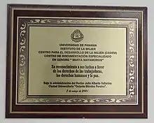 Matamoros died on 28 December 2005[1] in her apartment in Santa Ana[2] and has become, along with Domingo Barría and Angel Gómez, "synonymous with organized labor" in the Panamanian psyche.[13] In 1994, she was awarded the Grand Cross of the Order of Omar Torrijos Herrera.[1][14] She was honored by the University of Panama as one of the 100 outstanding women of Panama during the centennial celebration of Panama and the Institute for Women of the university is named in her honor. The Library of the National Confederation of Workers of Panama bears her name, as does a conference room in the Ministry of Labor and Workforce Development.[1] In 2006, an executive decree created the Order of Marta Matamoros to honor women who have been role models and strengthened the nation by working for socio-economic, political or cultural aims to improve gender equality of society.[1][15]