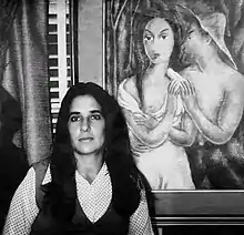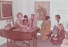 Marta Permuy, center, speaking with Cuban art critic Mauricio Fernández,[23][24] right, at Permuy Gallery's reception room during one of the Friday gallery nights, 1974. In the background, artwork by Wifredo Lam (center) and Cundo Bermudez (left).