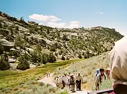 About 100,000 people visit the site each year, with the majority being LDS Church members.[10] Every year thousands of the church's youth participate in "Handcart Treks" through the area near Martin's Cove.[11] These Treks involve dressing up in period clothing while spending several days pulling handcarts and camping out along the Mormon Trail. The highlight of their Trek is visiting Martin's Cove and nearby Devil's Gate, along with the LDS Visitors' Center.