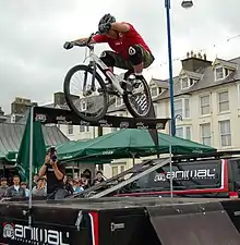 Martyn Ashton is a retired trials and stunt cyclist who started-out as a child motorcycle trials rider but took-up mountain bike trials in the early 1990s. He is a four-time British Biketrial Champion and former World Expert Biketrial Champion, and the Guinness World Record Holder for the Mountain Bike High Jump.[8] In 2008 he entered the Mountain Biking UK 'Hall of Fame'.[3]