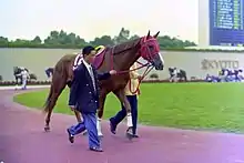 On 9 October Marvelous Crown was one of ten horses to contest the Grade II Kyoto Daishoten over 2500 metres at Hanshin. He won from Ayrton Symboli and Machikane Allegro in a record time of 2:31.0. The thirteenth running of the Japan Cup at Tokyo Racecourse saw four Japanese-trained horses face ten challengers from abroad in front of 165,930 spectators.[8] The North American challenge comprised Sandpit (the 7/2 favourite), Paradise Creek, Fraise, Grand Flotilla (Marvelous Crown's older half-brother) and Johann Quatz (winner of the Prix Lupin when trained in France). The European contingent comprised Hernando, Apple Tree (Grand Prix de Saint-Cloud, Coronation Cup) and Raintrap (Canadian International Stakes). The other overseas runners were Jeune from Australia and Rough Habit from New Zealand. Starting at odds of 9.6/1 Marvelous Crown, with Katsumi Minai in the saddle, was the most fancied of the Japanese horses ahead of Royce and Royce, Nice Nature and Fujiyama Kenzan. Sandpit went to the front in the early stages and established a clear lead as Minai settled Marvelous Crown on the inside in third place alongside Johann Quatz and Fujiyama Kenzan. Sandpit gave way in the straight and Paradise Creek took the lead from Royce and Royce, but Marvelous Crown continued to make along the rail. The Japanese gelding caught the American challenger in the final stride and won by a nose with Royce and Royce taking third ahead of Hernando.[9] Hinai admitted "I was not sure if I won until I saw the scoreboard".[10]