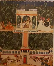 Marwar painting is known for its rich iconography, which includes deities, animals, birds, and plants. The paintings often depict scenes from the Ramayana and Mahabharata, as well as local legends and folktales. The artists also draw inspiration from nature, incorporating images of birds, flowers, and other natural elements into their work. Sociological subjects were quite popular in eighteenth century in this style. Character of Panchatantra and Suknasika, potter, washerman, labourer, wood-cutter, hunter, barber, waterman, goldsmith, businessman, panibarin, milkman, gardener, farmer and their related lives were painted frequently. The traditional Ragamala paintings were also commons subjects.[7][8] Drawings of places, forts, and majestic buildings catered to the royal taste but the depiction of scenery catered to the taste of Marwari capitalists.[9]
