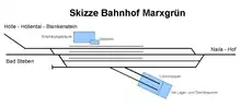 The old Marxgrün station was located on the Hof–Bad Steben railway which was opened in 1887. It was the terminus on that line until 1898. From 1901 it became the junction for the railway line through the Höllen valley to Gera and, later, also Saalfeld. With the end of the Second World War the Höllen Valley railway (Höllentalbahn) losts its pan-regional significance and it was completely closed in the early 1980s. Today a halt has been built (Haltepunkt Marxgrün) on the site of the former station which is part of the Regionalbahn from Hof to Bad Steben. The village of Marxgrün has been a district of the town of Naila since 1978.