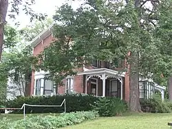 Construction of the Mary Birdsall House, as it came to be known, began in 1859 and was completed in 1860.[54] The Birdsalls called the home "Brightbank."[55] The Italianate house is located on a large lot at the northwest corner of West Fifth Street and Richmond Avenue in Richmond, Indiana. The builders used bricks from the Thistlethwaite brick yard on an adjacent property. The two-story, cruciform house is remarkably similar to a plan published in 1872 by Catherine Beecher and Harriett Beecher Stowe in their book, American Woman's Home. The book promoted a scientific approach to home design[3] The Birdsall's son, William W., acquired the home in 1896. The house was sold to Charles and Laura Moore in 1899.[36]