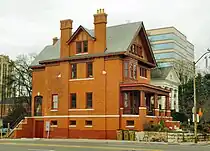 The Mary Boyce Temple House, located at 623 Hill Avenue in Knoxville, is the last single-family residence in the city's downtown area.[7] This house was built in 1907, and originally occupied by the Chambliss family.[7] Temple, who had lived for many years with her father in a house built around 1830 by William Park at the corner of Market Street and Cumberland (no longer standing), bought the house now named for her in 1922, and died in the house in 1929.[6] After a series of ownership changes and modifications over the decades, the house, threatened with demolition, was purchased in 2006 by Brian Pittman, who has since taken steps to renovate and restore it.[6]