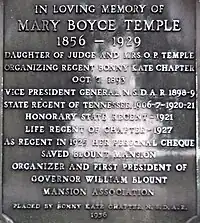 Mary Boyce Temple (July 6, 1856 – May 16, 1929) was an American philanthropist and socialite, active primarily in Knoxville, Tennessee, in the late 19th and early 20th centuries. She was the first president of the Ossoli Circle, the oldest federated women's club in the South, and published a biography of the club's namesake, Margaret Fuller Ossoli, in 1886.[2] She also cofounded the Tennessee Woman's Press and Author's Club, the Knoxville Writer's Club, and the Knox County chapter of the League of Women Voters.[3] She represented Tennessee at various international events, including the Paris Exposition of 1900 and at the dedication of the Panama Canal in 1903.[2]