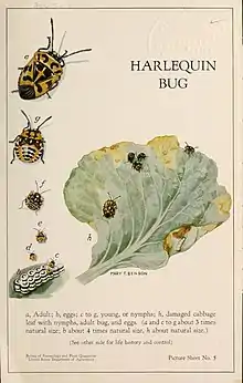 From mid 1960s until her retirement in 1972, she worked with professor William Harry Lange, Jr., another UC Davis entomologist, on an unpublished research on various agricultural pests.[1][10] Just like in the case of Mealybugs of California and an earlier publication Insects: The Yearbook of Agriculture 1952, Foley Benson juxtaposed images of insect lifecycle with their host plants and habitat. She reused a magnifying glass visual tool from Mealybugs of California to emphasize the insect specimens, some of which are only a few millimeters long. These illustrations feature a variety of agricultural crop pests such as moths, worms, maggots, flies, aphids, weevils, and plant bugs, other pests such as snails and slugs, and insect predators which feed on pests such as lacewings, sawflies and lady beetles. The Lange series were consequentially donated to the Bohart Museum of Entomology by Ellen Lange, while the McKenzie collection is shared between the Bohart Museum, Department of Entomology and Shields library at UC Davis.[18]