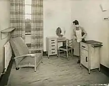 In 1942, she became the first woman architect employed by the Commonwealth government's Department of Works and later encouraged Cynthia Teague to join her.[1][3] Her initial role for the Department was munitions factory design before working on kitchen design for the food services section and finally the Industrial Welfare Division.[2] It was in the latter that her role shifted from design to planning and policy development.[3]