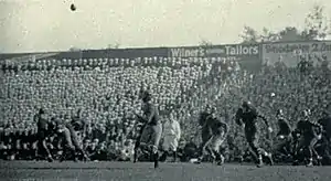 In 1913, Maryland Agricultural compiled a 6–3 record. The team shut-out four Maryland state universities: Johns Hopkins (26–0), Western Maryland (46–0), St. John's (13–0), and Washington College (20–0). For the feat, Maryland Agricultural won the state championship. In 1914, the MAC tallied a 5–3 record. In intrastate play, the Farmers recorded wins over Johns Hopkins, St. John's, and Washington College, and a loss to Western Maryland. Once again, the team secured the state championship.[23] The following year, Maryland met Johns Hopkins at Homewood Field on Thanksgiving Day, which drew the venue's all-time record crowd of 13,000 spectators. Hopkins won a hard-fought defensive struggle, 3–0, and the two teams met on the occasion all but two subsequent years through 1934, the final game of the series.[24]