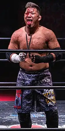 In early 2011, Takeda participated in the Ikkitosen Death Survival Tournament, finishing first in his block with 6 points, but losing to Takashi Sasaki in the final.[11] Takeda received his third opportunity at the BJW Deathmatch Heavyweight Championship in February 2012, losing to Abdullah Kobayashi in an Open Finger Gloves Spike Nail Deathmatch.[12] Takeda made his debut outside of Japan in June 2013, losing to Combat Zone Wrestling (CZW)'s Drake Younger in a deathmatch in Germany.[13] Takeda unsuccessfully challenged for the BJW Deathmatch Heavyweight Championship for the fourth time on June 30, losing to Shuji Ishikawa.[14] In February 2014, while riding his motorcycle, Takeda was involved in an accident, injuring his ankle and missing 4 months of action. He wrestled his return match on June 14, losing to Danny Havoc in the first round of the 2014 Tournament Of Death for CZW in the United States.[15] Takeda received his 5th opportunity at the Deathmatch Heavyweight Championship in August, losing to Yuko Miyamoto.[16] In early 2015, Takeda again participated in the Ikkitosen Survival Tournament, finishing first in his block with 8 points but losing to Abdullah Kobayashi in the final.[17] On August 19, 2017, Takeda defeated Masaya Takahashi to win the BJW Deathmatch Heavyweight Championship for the first time in his career.[18]