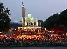 One factor against construction of the lake was the nearly 20-metre-high (66 ft) Bismarck Tower that stood in the centre of the proposed water feature. Here, paramilitary marches took place, and it was the site of a book burning in 1933. The landmark was eventually demolished in 1935 during the course of the lake's construction.