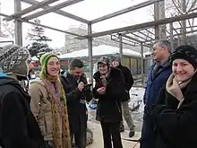 In the morning of February 16, day 6 of the sit-in the protesters set a polyethylene cover on the kiosk carcass they were occupying to protect themselves from the abundant snow, and were approached by three civilians, presumably - associated with the construction, demanding to take the cover off.
