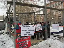 Mashtots Park Movement (Armenian: Մաշտոցի պուրակի շարժում), also known as #SaveMashtotsPark and OccupyMashtots began as a sit-in on February 11, 2012 in Mashtots Park, Yerevan.[3] The protest was initiated by "This City Belongs to Us" civic initiative, and grew into a full-scale movement. The main issues were illegal or inadequate constructions, the destruction of trees and green zones in Yerevan, but now the questions of citizens' self-determination, fight against corruption and oligarchy, the prevalence of public interests over private have been raised. While the US occupy movements act against the bureaucratic system resulting in social and economic inequality, Mashtots Park Movement places itself in a different socioeconomic context - oligarchy, "people above the law" who, having economical and political resources, place their interests above those of the people.[4]