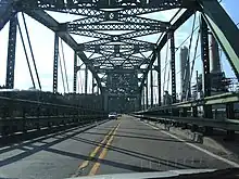 The current structure was completed and opened in December 2015 after a three-year project costing $49.6 million to replace the previous truss bridge that was built in 1925 and rehabilitated in 1993.[1] The first two lanes of the new bridge were completed in 2013, at which point the old truss bridge was imploded to make way for the other two lanes of the new bridge. It cost $50 million to build the new bridge.[2] The new bridge was constructed by Brayman Construction.[3]