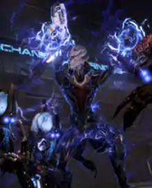 Shepard's squadmates do not appear for the duration of the pack; Aria accompanies Shepard throughout the course of the narrative.[1] They are joined in Omega by Nyreen Kandros, a turian biotic operative who has assumed command of the local Talon mercenary group.[6] While the player is usually assisted by Aria and Nyreen that are controlled by the game's artificial intelligence, Omega occasionally involves the player to fight solo.[7] Two new enemy types were introduce in Omega: the Rampart mech, combat androids deployed by Cerberus to control the civilian population of Omega;[4] and the adjutants, husk-like creatures engineered by Cerberus through co-opting Reaper technology, which played an instrumental role in securing their victory over Aria's forces in Invasion.[3] Omega includes three achievements,[8] and also unlocks new weapon types and mods as well as two new biotic powers which could be assigned to Shepard upon completion of the pack.[3]