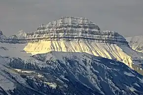 The mountain is composed of sedimentary rock laid down during the Precambrian to Jurassic periods.[4] Formed in shallow seas, this sedimentary rock was pushed east and over the top of younger rock during the Laramide orogeny.[5]