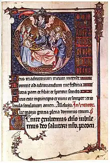 Until the 13th century illuminated manuscripts were predominantly created by monks in the scriptoria of monasteries. The 13th century saw a move away from monastic production to a manufacture of books by lay masters in commercial workshops.[2] Master Honoré was one such lay artisan, and one of the few whose actual name survives. In 1295 Master Honoré designed the miniatures in the Prayer Book of Philip the Fair. His figures are larger and have a relief-like modeling that seems more realistic.[3] The Parisian school of manuscript painting saw innovations of representational realism by Master Honoré; his successor within the workshop was Jean Pucelle.[4]